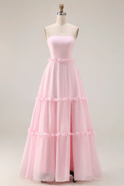 This romantic bridesmaid gown features a relaxed A-line silhouette, a strapless and sleeveless design, and a light pink chiffon material that is light, drapes beautifully, and has a soft texture. Multiple ruffles add a touch of playfulness, while the fitted waist accentuates the figure. The long length makes it suitable for formal occasions such as weddings, making it a bridesmaid outfit that combines sweetness and elegance.