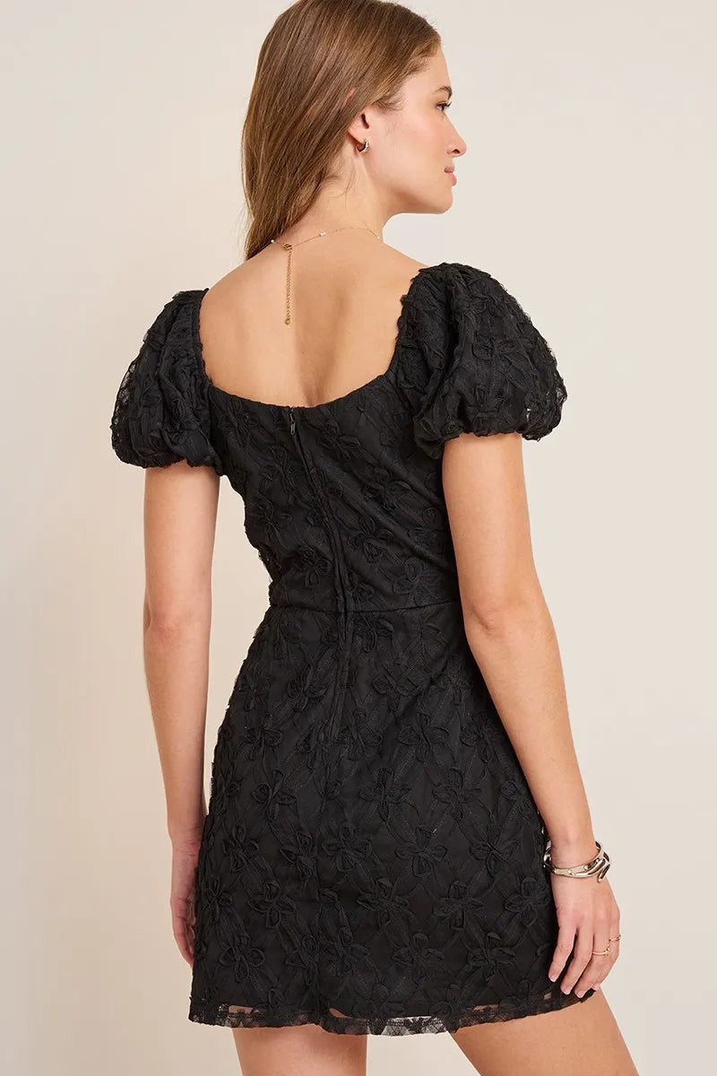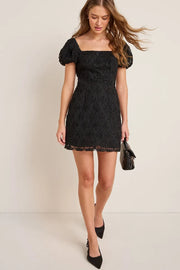 This black dress presents a vintage and exquisite temperament with a Sheath silhouette, featuring a square neck and bubble short sleeved design to embellish the shoulders and neck. The three-dimensional jacquard fabric has a high-end texture, and the slim fit short skirt is elegant and suitable for occasions such as back to school dances. It is a Homecoming style that combines atmosphere and fashion.