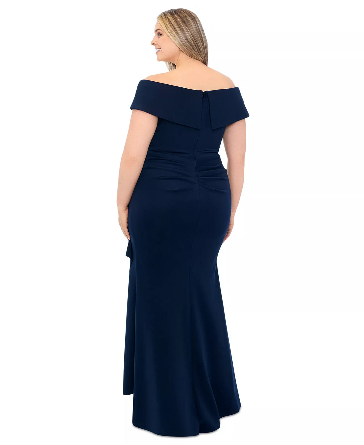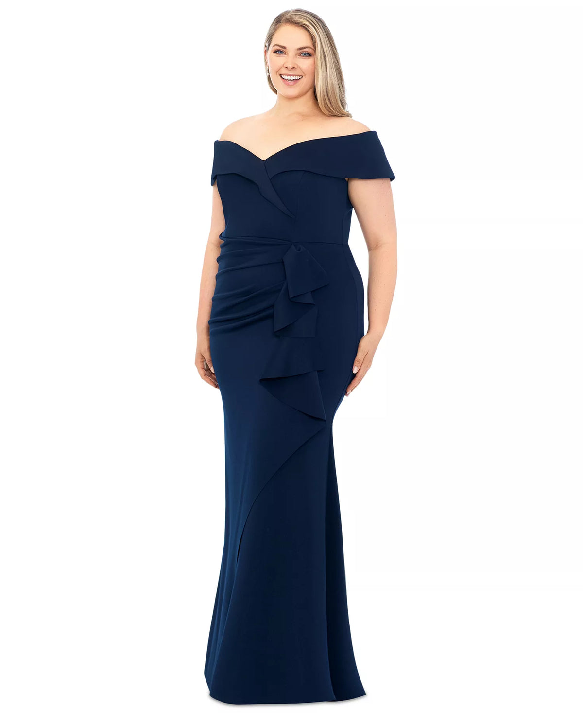 This elegant plus-size dress is crafted from a navy blue matte fabric. The off-the-shoulder and short-sleeved design accentuates the neck and shoulders, while the front knot and ruffle details add depth. The fishtail silhouette hugs the body, showcasing elegant curves, and the simple back slit design makes it suitable for formal occasions such as banquets and weddings. It is the top choice for plus-size women who appreciate modern style.