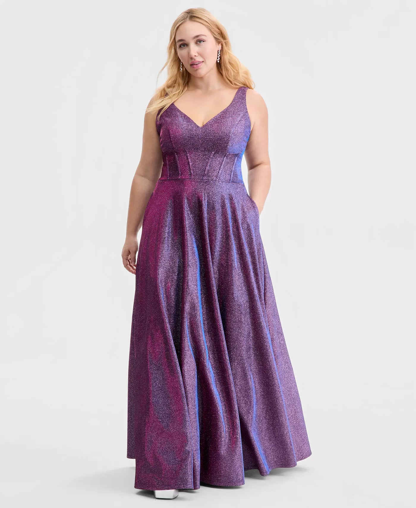 This dazzling plus-size dress is crafted from iridescent shimmering fabric. The deep V-neck and sleeveless design accentuate the neck and shoulders, while the boning waist highlights the figure. The flowing A-line skirt adds a touch of elegance, and the side pockets are both aesthetically pleasing and practical. Suitable for formal occasions such as balls and banquets, it is the top choice for plus-size women who seek a glamorous look.