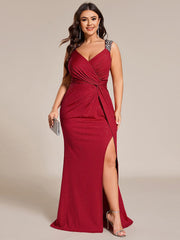 This dazzling plus-size dress is crafted from burgundy shimmering fabric. The sweetheart neckline and sleeveless design accentuate the neck and shoulders, while the delicate beaded embellishments on the shoulders add a touch of luxury. The knotted details at the front add depth, and the fishtail silhouette hugs the body. The front slit adds a touch of sexiness, making it suitable for formal occasions such as balls and banquets. It is the top choice for plus-size women who seek a glamorous atmosphere.