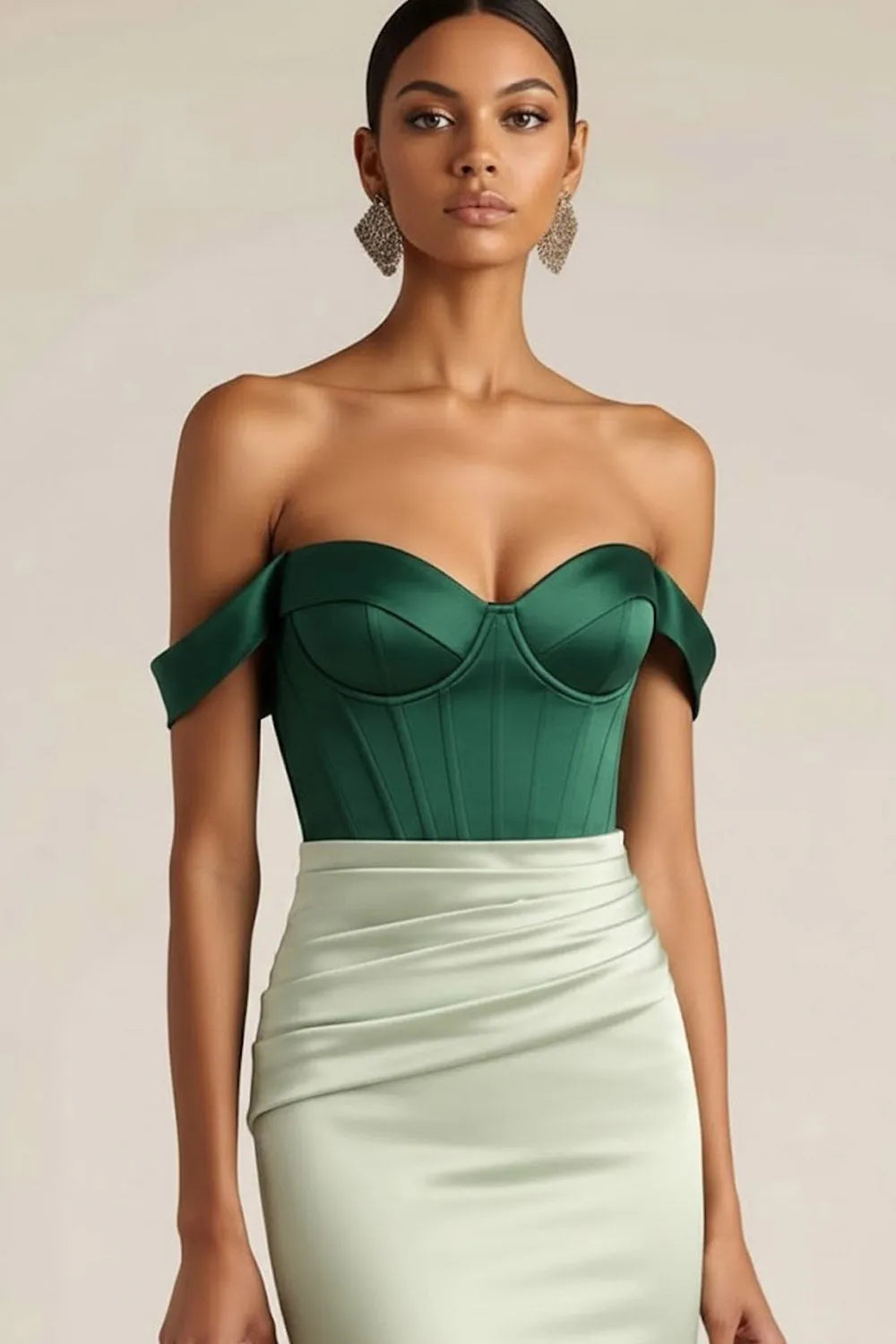 This contrasting Prom dress features a one shoulder heart-shaped collar design, with a combination of dark green and light green satin to create a high-end and eye-catching look. The slim fit fish tail design fits the body and showcases elegant curves. The back strap style is suitable for the body shape, and the floor length is suitable for graduation parties, dinners, and other occasions, showcasing vintage delicacy.