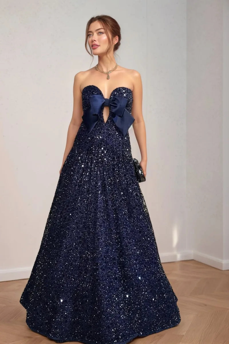 This navy blue long dress features a Ball Gown silhouette to create a sparkling atmosphere, with a strapless heart-shaped neckline and a large bow decoration on the chest that is exquisite and eye-catching. The full body sequin material is suitable for lighting occasions, and the backless design adds sexiness. The fluffy skirt hem is gorgeous, making it the focal point of Prom styling.