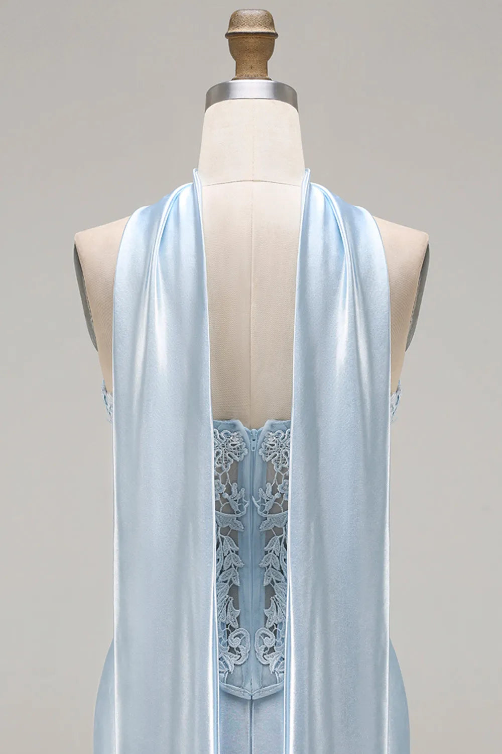 This light blue satin Prom dress features a hanging neck and heart-shaped strapless design, with exquisite and gorgeous lace (sequined) decoration on the upper body. The fish tail shape fits the body and outlines elegant curves. The long back ribbon and small tail enhance the sense of ceremony. The satin material has its own luster and is suitable for occasions such as graduation parties and evening banquets, showing a noble and dynamic look.
