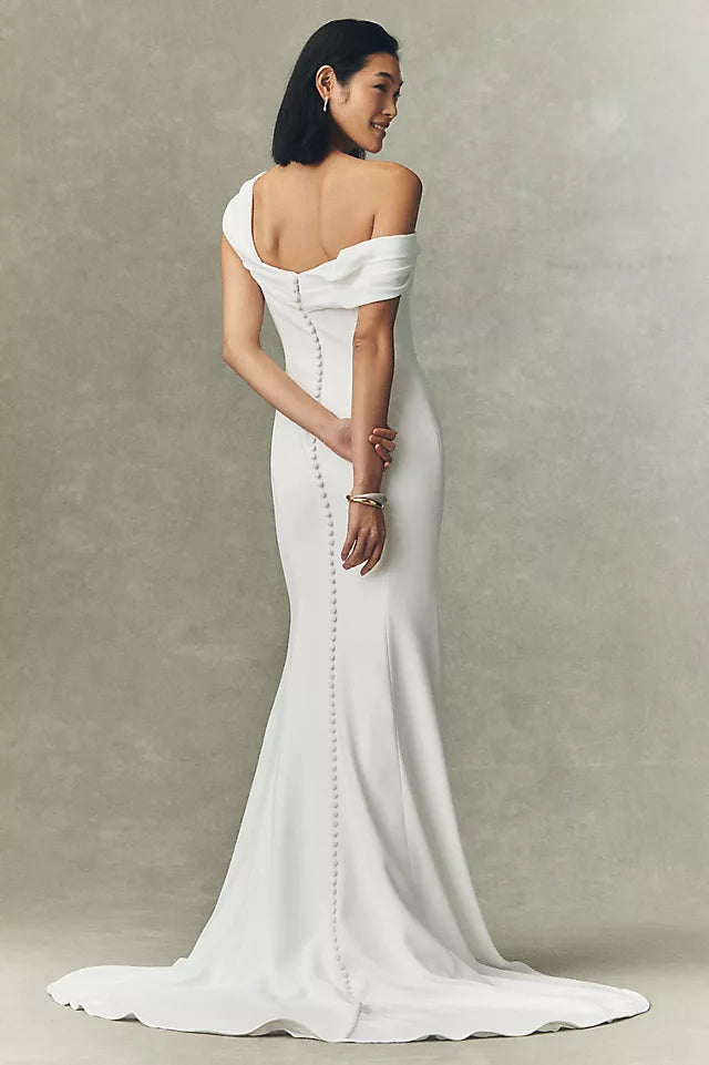This minimalist modern wedding dress is crafted from high-elastic satin. The asymmetrical off-the-shoulder neckline and sleeveless design accentuate the neck and shoulders, while the mermaid silhouette hugs the body, showcasing elegant curves. The pearl button detailing at the back adds a touch of vintage charm, and the gown features a church train. Suitable for simple yet grand settings such as outdoor weddings and estate weddings, this dress is the perfect choice for brides seeking a modern look.
