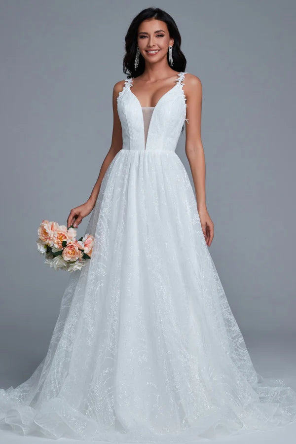 Sparkly A-Line V-Neck Spaghetti-Strap Lace-Up-Back Chapel-Train Wedding Dresses