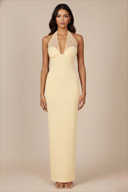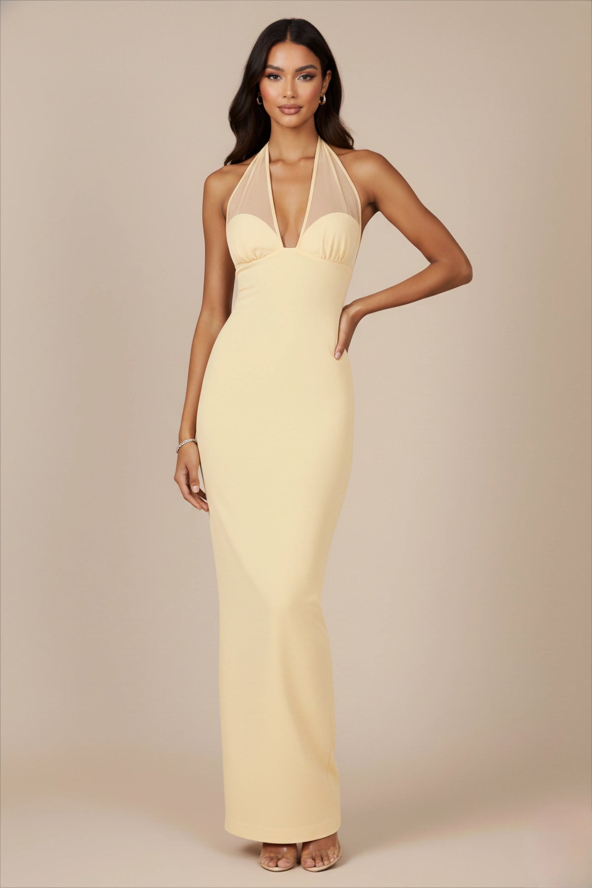 This light yellow long dress features a Sheeth silhouette that fits the body, with a deep V-neck and a hanging neck mesh design that is delicate and gentle. The elastic fabric exudes a slim fit texture, making it an elegant choice for Prom styling.