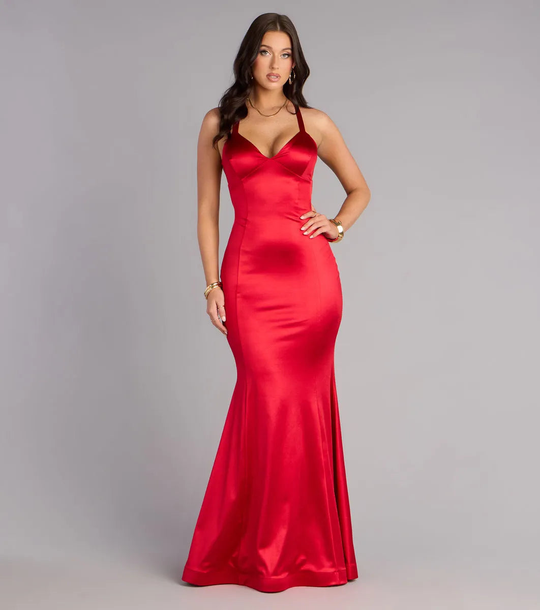 This stunning and eye-catching evening gown is crafted from bright red satin. The sweetheart halter neck and sleeveless design accentuate the neck and shoulders, while the fitted mermaid silhouette flatters the figure. The crisscrossing straps at the back add a touch of sexiness, and the flowing skirt exudes elegance and sophistication. It is suitable for formal occasions such as balls and banquets, making it the top choice for fashionable women who seek a bright and sophisticated look.