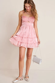 This pink dress presents a sweet and romantic temperament with an A-Line silhouette, featuring a heart-shaped strapless and thin shoulder strap design to embellish the shoulders and neck. The velvet and chiffon patchwork fabric has a soft and glossy finish, and the hollow waist and multi-layered skirt details are dynamic and exquisite. The large backless design is suitable for occasions such as back to school dances, making it the perfect choice for a Homecoming look that combines girlishness and fashion.